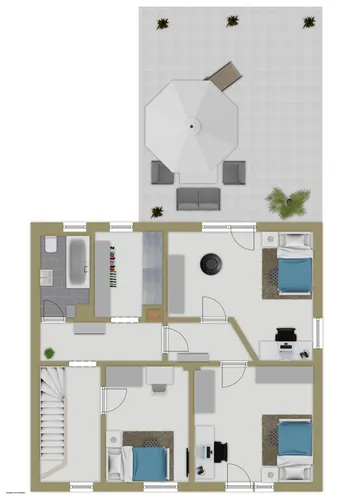 HausansichtGartenansichtEingangsbereichFlurBadezimmer EGZimmer 1 EGZimmer 2 EGKochbereichOffener Wohn EssbereichFlur OGZimmer 1 OGBadezimmerZimmer 2 OGDachterrasseZimmer 3 OGRückansichtErdgeschoss und AußenbereichObergeschossKellergeschossLageplan
