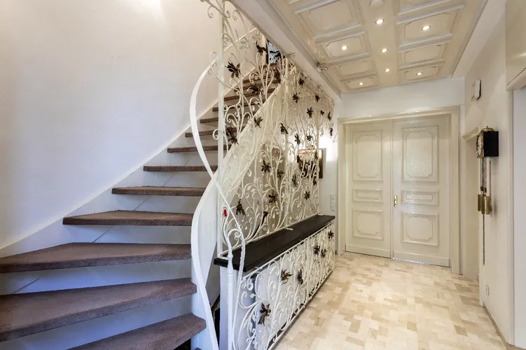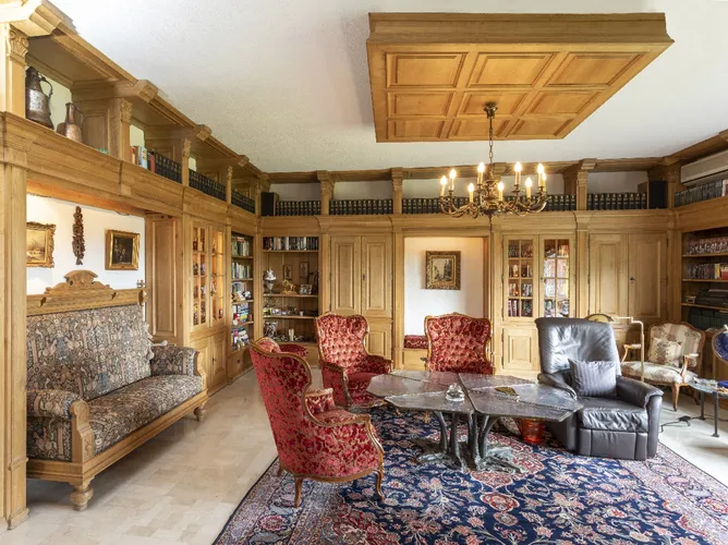 Ca. 480 m² WohnflächeGärtnerisch angelegtes GrundstückCa. 3800 m² großes GrundstückRepräsentatives EntréeDer Wohnbereich im EGBibliothek im EGSchlafzimmer im DGWeiterer Wohnbereich im DGGroße Loggia im DGAusblick von der LoggiaPferdestallungen im GebäudeGrundriss EGGrundriss DGGrundriss KG