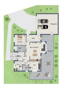 4 Zimmer, offene Wohnküche, Diele, 2 x Bad/WC, Hauswirtschaftsraum, Haustechnik, Terrasse und große Doppelgarage mit Toilette.