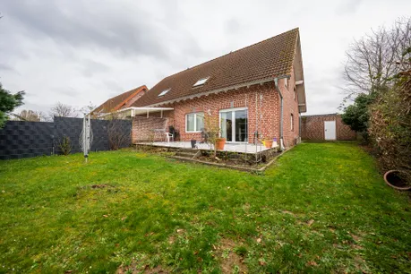 Auf ca. 155 m² Wohnfläche verteilen sich fünf Zimmer über Erdgeschoss, Obergeschoss und ein ausgebautes Dachgeschoss. Der offen gestaltete Wohn- und Essbereich bildet das Herzstück des Hauses und bietet dank großer Fensterflächen eine freundliche, lichtdurchflutete Atmosphäre. Von hier aus besteht direkter Zugang zur Terrasse sowie in den pflegeleicht angelegten Garten.